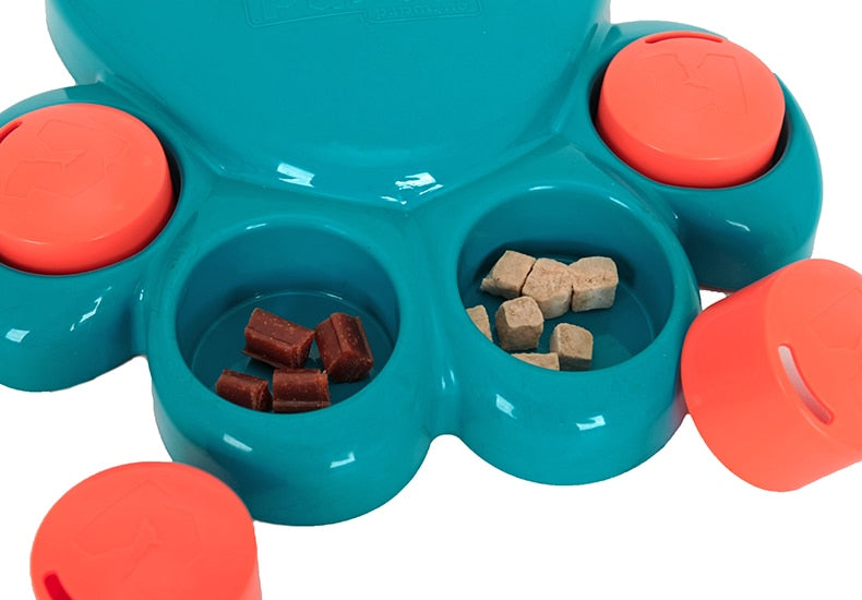 The base of this toy has 6 compartments where you can put your dog's favorite treat. After you cover the treats with cups and place in on the floor the play begins! Your dog will smell the treats through the holes in the cups and will be very motivated to remove them to get to the delicious reward. You will see how quickly they'll get used to it while it will train their coordination. The base has rubber stands on the bottom, so it won't move around during the play. Game on!